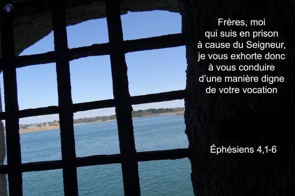 Frères, moi qui suis en prison à cause du Seigneur, je vous encourage à suivre fidèlement l'appel que vous avez reçu de Dieu : ayez beaucoup d'humilité, de douceur et de patience, supportez-vous les uns les autres avec amour ; ayez à cœur de garder l'unité dans l'Esprit par le lien de la paix. Comme votre vocation vous a tous appelés à une seule espérance, de même il n'y a qu'un seul Corps et un seul Esprit. Il n'y a qu'un seul Seigneur, une seule foi, un seul baptême, un seul Dieu et Père de tous, qui règne au-dessus de tous, par tous, et en tous.