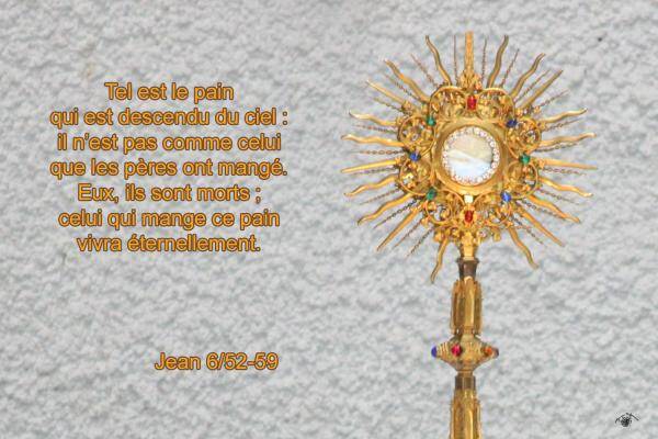 Les Juifs discutaient entre eux : « Comment cet homme-là peut-il nous donner sa chair à manger ? » Jésus leur dit alors : « Amen, amen, je vous le dis : si vous ne mangez pas la chair du Fils de l'homme, et si vous ne buvez pas son sang, vous n'aurez pas la vie en vous. Celui qui mange ma chair et boit mon sang a la vie éternelle ; et moi, je le ressusciterai au dernier jour. En effet, ma chair est la vraie nourriture, et mon sang est la vraie boisson. Celui qui mange ma chair et boit mon sang demeure en moi, et moi je demeure en lui. De même que le Père, qui est vivant, m'a envoyé, et que moi je vis par le Père, de même aussi celui qui me mangera vivra par moi. Tel est le pain qui descend du ciel : il n'est pas comme celui que vos pères ont mangé. Eux, ils sont morts ; celui qui mange ce pain vivra éternellement. » Voilà ce que Jésus a dit, dans son enseignement à la synagogue de Capharnaüm.