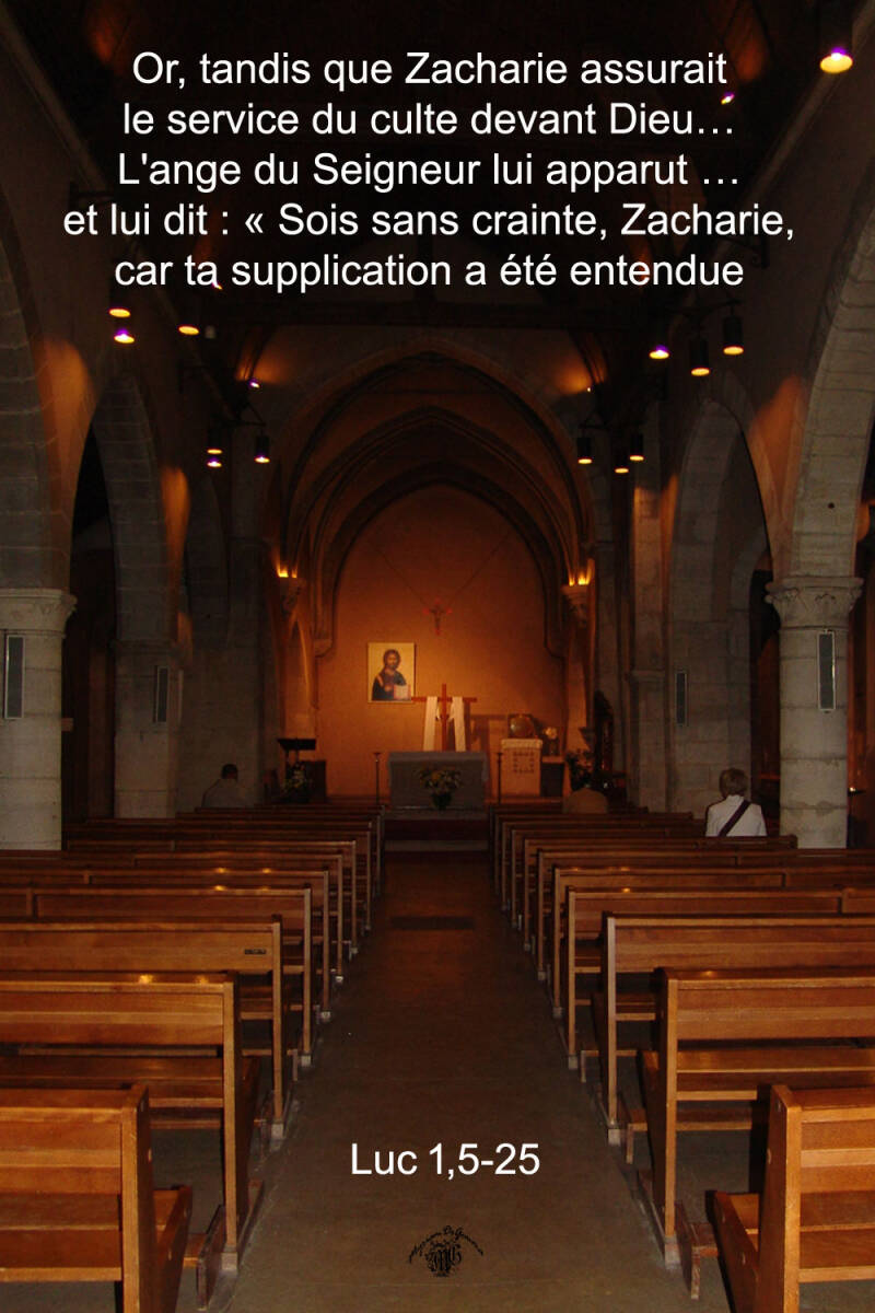 Il y avait, au temps d'Hérode le Grand, roi de Judée, un prêtre nommé Zacharie, du groupe d'Abia. Sa femme aussi était descendante d'Aaron ; elle s'appelait Élisabeth.Tous les deux vivaient comme des justes devant Dieu : ils suivaient tous les commandements et les préceptes du Seigneur d'une manière irréprochable. Ils n'avaient pas d'enfant, car Élisabeth était stérile, et tous deux étaient âgés. Or, tandis que Zacharie, au jour fixé pour les prêtres de son groupe, assurait le service du culte devant Dieu, il fut désigné par le sort, suivant l'usage liturgique, pour aller offrir l'encens dans le sanctuaire du Seigneur. Toute l'assemblée du peuple se tenait dehors en prière à l'heure de l'offrande de l'encens. L'ange du Seigneur lui apparut debout à droite de l'autel de l'encens. En le voyant, Zacharie fut bouleversé et saisi de crainte. L'ange lui dit : « Sois sans crainte, Zacharie, car ta supplication a été entendue : ta femme Élisabeth te donnera un fils, et tu le nommeras Jean. Tu seras dans la joie et l'allégresse, beaucoup d'hommes se réjouiront de sa naissance, car il sera grand devant le Seigneur. Il ne boira pas de vin ni de boissons fermentées, et il sera rempli de l'Esprit Saint dès avant sa naissance ; il fera revenir de nombreux fils d'Israël au Seigneur leur Dieu, il marchera devant le Seigneur, avec l'esprit et la puissance du prophète Élie, pour faire revenir le cœur des pères vers leurs enfants, convertir les rebelles à la sagesse des hommes droits, et préparer au Seigneur un peuple capable de l'accueillir. » Mais Zacharie dit à l'ange : « Comment vais-je savoir que cela arrivera ? Moi, je suis un vieil homme, et ma femme aussi est âgée. » L'ange lui répondit : « Je suis Gabriel ; je me tiens en présence de Dieu, et j'ai été envoyé pour te parler et pour t'annoncer cette bonne nouvelle. Mais voici que tu devras garder le silence, et tu ne pourras plus parler jusqu'au jour où cela se réalisera, parce que tu n'as pas cru à mes paroles : elles s'accompliront lorsque leur temps viendra. » Le peuple attendait Zacharie et s'étonnait de voir qu'il restait si longtemps dans le sanctuaire. Quand il sortit, il ne pouvait pas leur parler, et ils comprirent qu'il avait eu une vision dans le sanctuaire. Il leur faisait des signes, car il demeurait muet. Lorsqu'il eut achevé son temps de service au Temple, il repartit chez lui. Quelque temps plus tard, sa femme Élisabeth devint enceinte. Pendant cinq mois, elle garda le secret. Elle se disait : « Voilà ce que le Seigneur a fait pour moi, lorsqu'il a daigné mettre fin à ce qui faisait ma honte aux yeux des hommes. »