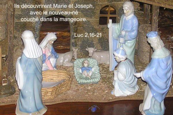 En ce temps-là, les bergers se hâtèrent d’aller à Bethléem, et ils découvrirent Marie et Joseph, avec le nouveau-né couché dans la mangeoire. Après avoir vu, ils racontèrent ce qui leur avait été annoncé au sujet de cet enfant. Et tous ceux qui entendirent s’étonnaient de ce que leur racontaient les bergers. Marie, cependant, retenait tous ces événements et les méditait dans son cœur. Les bergers repartirent ; ils glorifiaient et louaient Dieu pour tout ce qu’ils avaient entendu et vu, selon ce qui leur avait été annoncé. Quand fut arrivé le huitième jour, celui de la circoncision, l’enfant reçut le nom de Jésus, le nom que l’ange lui avait donné avant sa conception.