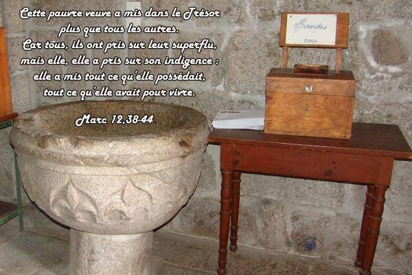 Levant les yeux, il vit les gens riches qui mettaient leurs offrandes dans le tronc du trésor. Il vit aussi une veuve misérable y déposer deux piécettes. Alors il déclara: «En vérité, je vous le dis: cette pauvre veuve a mis plus que tout le monde. Car tous ceux-là ont pris sur leur superflu pour faire leur offrande, mais elle, elle a pris sur son indigence: elle a donné tout ce qu'elle avait pour vivre».