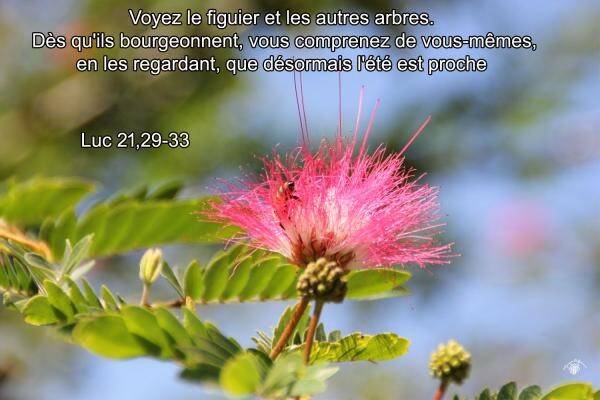 Et il leur dit une parabole : "Voyez le figuier et les autres arbres. Dès qu'ils bourgeonnent, vous comprenez de vous-mêmes, en les regardant, que désormais l'été est proche. Ainsi vous, lorsque vous verrez cela arriver, comprenez que le Royaume de Dieu est proche. En vérité, je vous le dis, cette génération ne passera pas que tout ne soit arrivé. Le ciel et la terre passeront, mais mes paroles ne passeront point.
