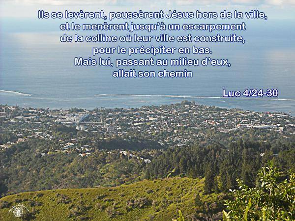 Dans la synagogue de Nazareth, Jésus déclara : « Amen, je vous le dis : aucun prophète ne trouve un accueil favorable dans son pays. En vérité, je vous le dis : Au temps du prophète Élie, lorsque pendant trois ans et demi le ciel retint la pluie, et qu’une grande famine se produisit sur toute la terre, il y avait beaucoup de veuves en Israël ; pourtant Élie ne fut envoyé vers aucune d’entre elles, mais bien dans la ville de Sarepta, au pays de Sidon, chez une veuve étrangère. Au temps du prophète Élisée, il y avait beaucoup de lépreux en Israël ; et aucun d’eux n’a été purifié, mais bien Naaman le Syrien. »À ces mots, dans la synagogue, tous devinrent furieux. Ils se levèrent, poussèrent Jésus hors de la ville, et le menèrent jusqu’à un escarpement de la colline où leur ville est construite, pour le précipiter en bas. Mais lui, passant au milieu d’eux, allait son chemin.