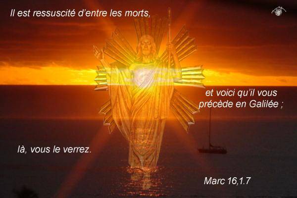 Le sabbat terminé, Marie Madeleine, Marie, mère de Jacques, et Salomé achetèrent des parfums pour aller embaumer le corps de Jésus. De grand matin, le premier jour de la semaine, elles se rendent au tombeau dès le lever du soleil. Elles se disaient entre elles : « Qui nous roulera la pierre pour dégager l’entrée du tombeau ? » Levant les yeux, elles s’aperçoivent qu’on a roulé la pierre, qui était pourtant très grande. En entrant dans le tombeau, elles virent, assis à droite, un jeune homme vêtu de blanc. Elles furent saisies de frayeur. Mais il leur dit : « Ne soyez pas effrayées ! Vous cherchez Jésus de Nazareth, le Crucifié ? Il est ressuscité : il n’est pas ici. Voici l’endroit où on l’avait déposé. Et maintenant, allez dire à ses disciples et à Pierre : “Il vous précède en Galilée. Là vous le verrez, comme il vous l’a dit.” »