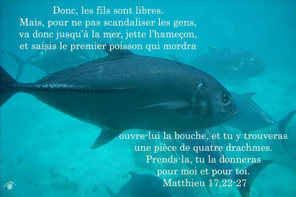 Comme Jésus et les disciples étaient réunis en Galilée, il leur dit : « Le Fils de l'homme va être livré aux mains des hommes ; ils le tueront et, le troisième jour, il ressuscitera. » Et ils furent profondément attristés. Comme ils arrivaient à Capharnaüm, ceux qui perçoivent les deux drachmes pour le Temple vinrent trouver Pierre et lui dirent : « Votre maître paye bien les deux drachmes, n'est-ce pas ? » Il répondit : « Oui. » Quand Pierre entra dans la maison, Jésus prit la parole le premier : « Simon, quel est ton avis ? Les rois de la terre, sur qui perçoivent-ils les taxes ou l'impôt ? Sur leurs fils, ou sur les autres personnes ? » Pierre lui répondit : « Sur les autres. » Et Jésus reprit : « Donc, les fils sont libres. Mais il faut éviter d'être pour les gens une occasion de chute : va donc jusqu'au lac, jette l'hameçon, et saisis le premier poisson qui mordra ; ouvre-lui la bouche, et tu y trouveras une pièce de quatre drachmes. Prends-la, tu la donneras pour toi et pour moi. »