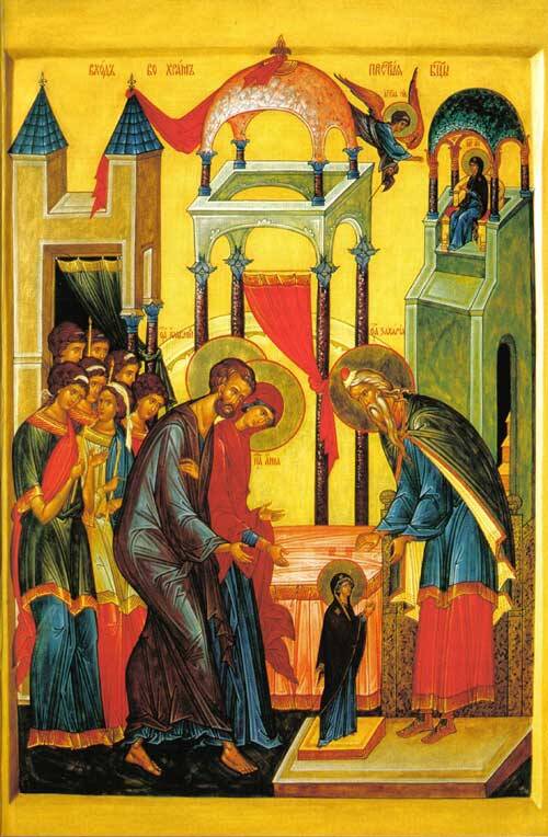L'origine de la fête de la Présentation de la Vierge Marie au Temple serait peut-être palestinienne puisque la vie de saint Jean le Silentiaire, écrite au milieu du VI° siècle par Cyrille de Scythopolis, nous apprend qu'en novembre 543, à Jérusalem, eut lieu la dédicace de la basilique Sainte-Marie-la-Neuve. En tous cas, à Constantinople, la fête de la Présentation de Marie est attestée dès le VIII° siècle, et des homélies de saint André de Crête (mort en 740) lui sont consacrées.